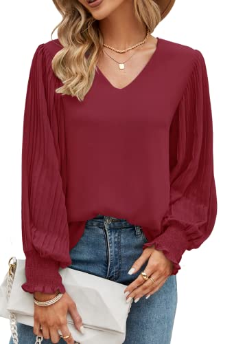 Odosalii Womens Long Sleeve Tops, Ladies Blouses, Casual Chiffon Shirt Solid Color V Neck Longline Tunic Tops to Wear with Leggings (Wine Red,Medium)