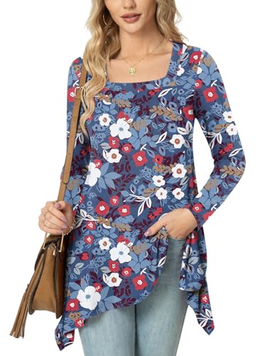 POPYOUNG Womens Casual Square Neck Tunic Tops Long Sleeve Ladies Longline Dress Floaty Long Blouse Shirts to wear with Leggings M,FL Blue Mix