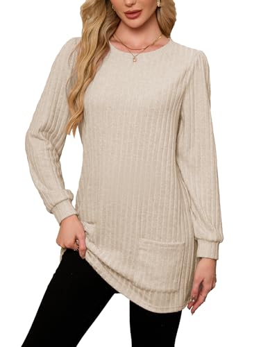 Famulily Long Tops to Wear with Leggings Ribbed Long Sleeve Sweatshirt Flattering 2025 Fall Winter Jumpers Beige L