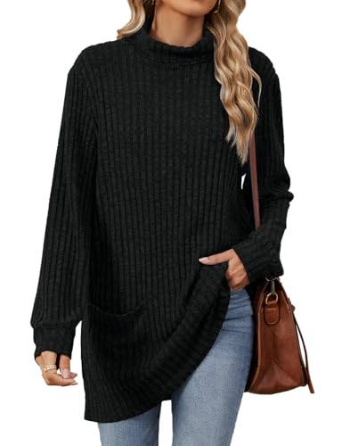 Flikity Womens Plus Size Jumpers, Long Sweaters for Women to Wear with Leggings Long Sleeve Top Turtle Neck Jumpers Women Knitted Tunic Blouses Ladies Longline Tops Black XL
