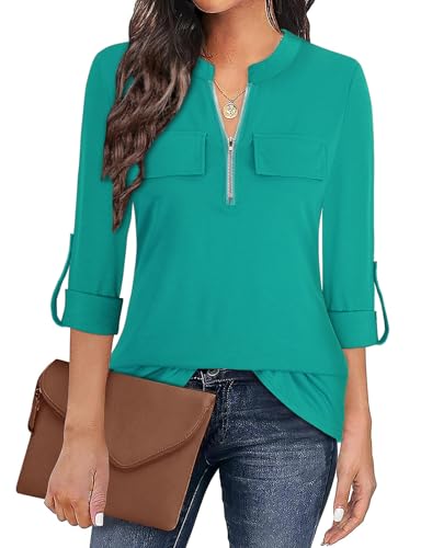 Gemulate 3/4 Sleeve Tops for Women UK Half Zip Tunics Blouse Cotton T Shirt Long Top to Wear with Leggings Fashion Ladies Plus Size Tops Polo Shirt Lake Green XL