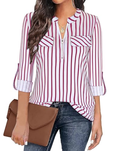 Gemulate Ladies Tops Red Striped Shirt for Women Zip Up Plaid Tunic Blouse 3 Quarter Sleeve Shirt for Women Floral Printed Shirts Long Tops to Wear with Leggings - Red White Stripe, L