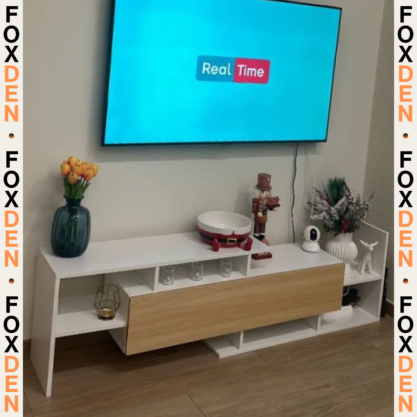 TV Unit Cabinet Stand with Drawrs Open Shelf Storage Cable Management White Wood