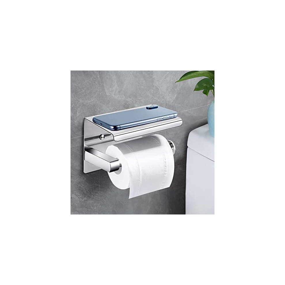 Joeji's Kitchen Toilet Paper Roll Holder with Shelf - Brushed Stainless Steel Wall Mounted Strong Adhesive or Screws Rustproof Loo Roll Dispenser with Phone Storage Shelf (Chrome Silver)