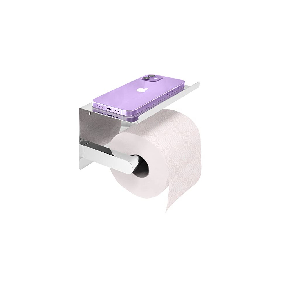 Toilet Paper Holder with Shelf - Wall-Mounted Stainless Steel Bathroom Loo Roll Storage Rack with Phone Tray, Chrome Finish
