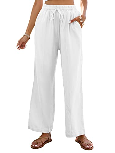 Famulily Ladies Casual Loose Cotton Linen Trousers High Waist Wide Leg Summer Beach Trousers with Adjustable Drawstring White S