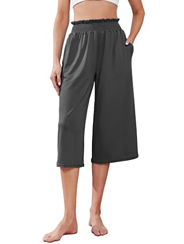 Famulily Ladies Cropped Summer Wide Leg Trousers Loose Fit Capri Pants with Pockets Dark Grey L