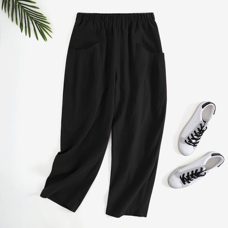 AIGOUT Women Linen Cropped Trousers with Elasticated Waist Ladies Wide Leg Trousers with Pockets, Baggy Capri Pants Summer Solid Casual Work Trousers Beach Pants Loose Fit Track Lounge (Black, S)