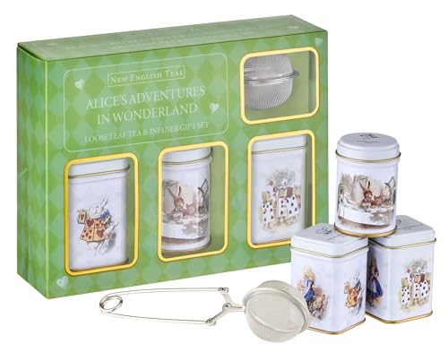 New English Teas Loose Leaf Tea & Infuser Gift Set – 3 Alice in Wonderland Tins with Breakfast, Earl Grey & Afternoon Blends with Loose Tea Infuser