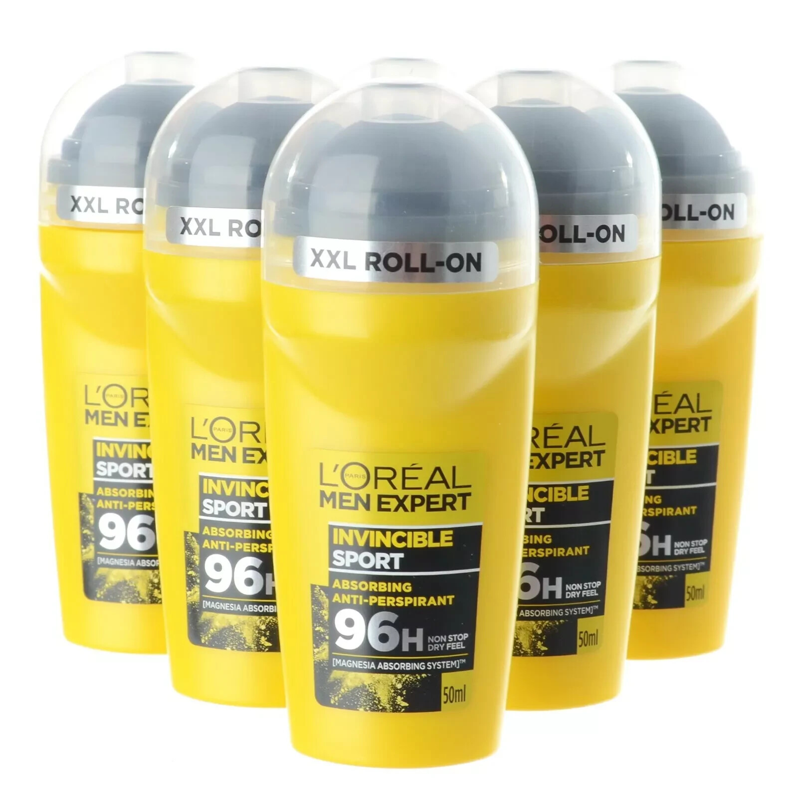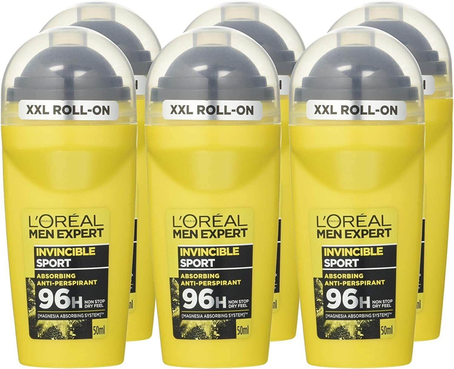 L'Oréal Paris Men Expert 96H Invincible Sport Anti-Perspirant Roll On Deodorant for Men, 50ml Pack of 6, Bulk Buy