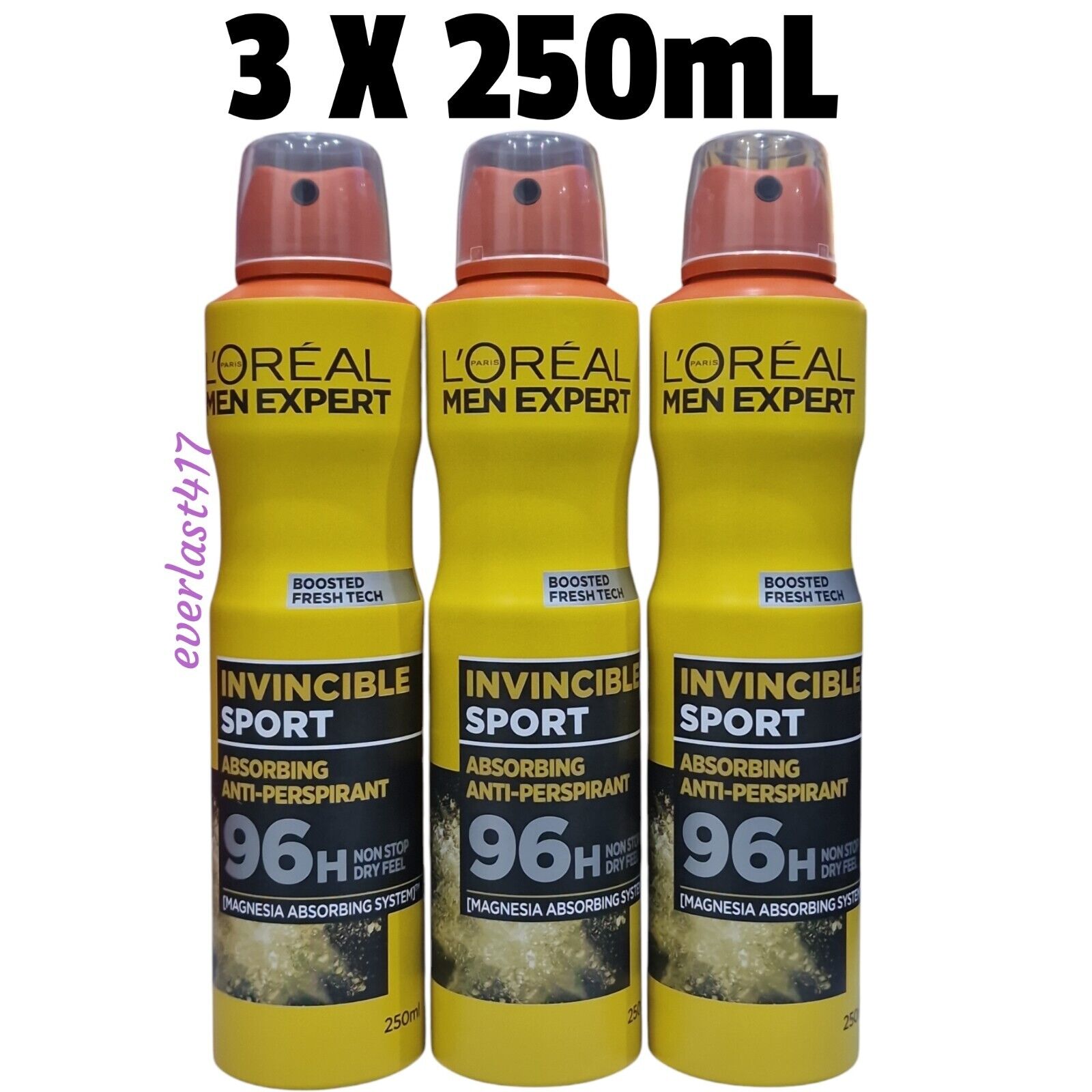 3 x 250ml Loreal Men Expert Invincible Sport 96H Anti-Perspirant Deodorant