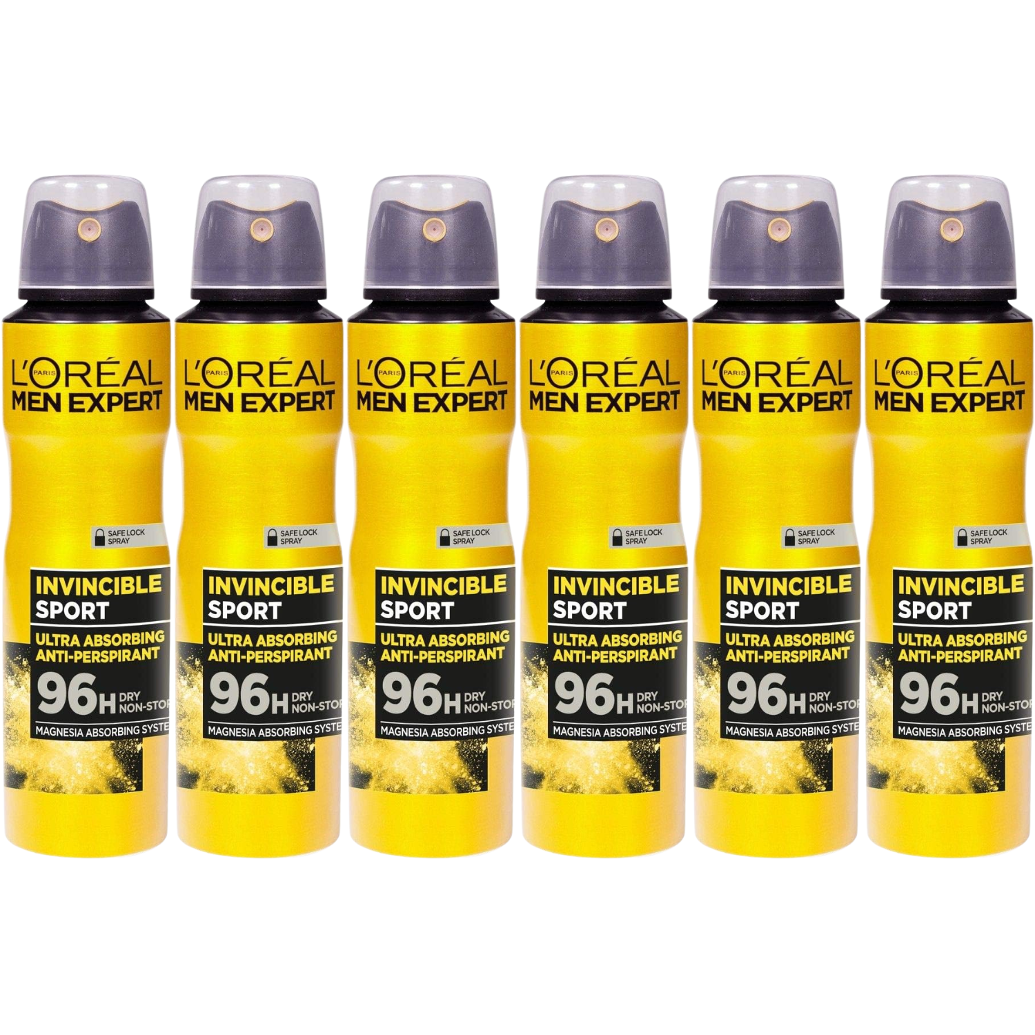 L'Oréal Paris Men Expert 96H Invincible Sport Anti-Perspirant Deodorant for Men, 250ml Pack of 6, Bulk Buy