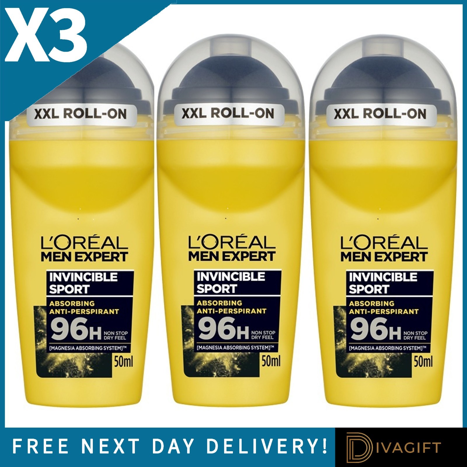 3 x LOREAL MEN EXPERT ROLL ON INVINCIBLE SPORT ANTI-PERSPIRANT DEODORANT 50ML