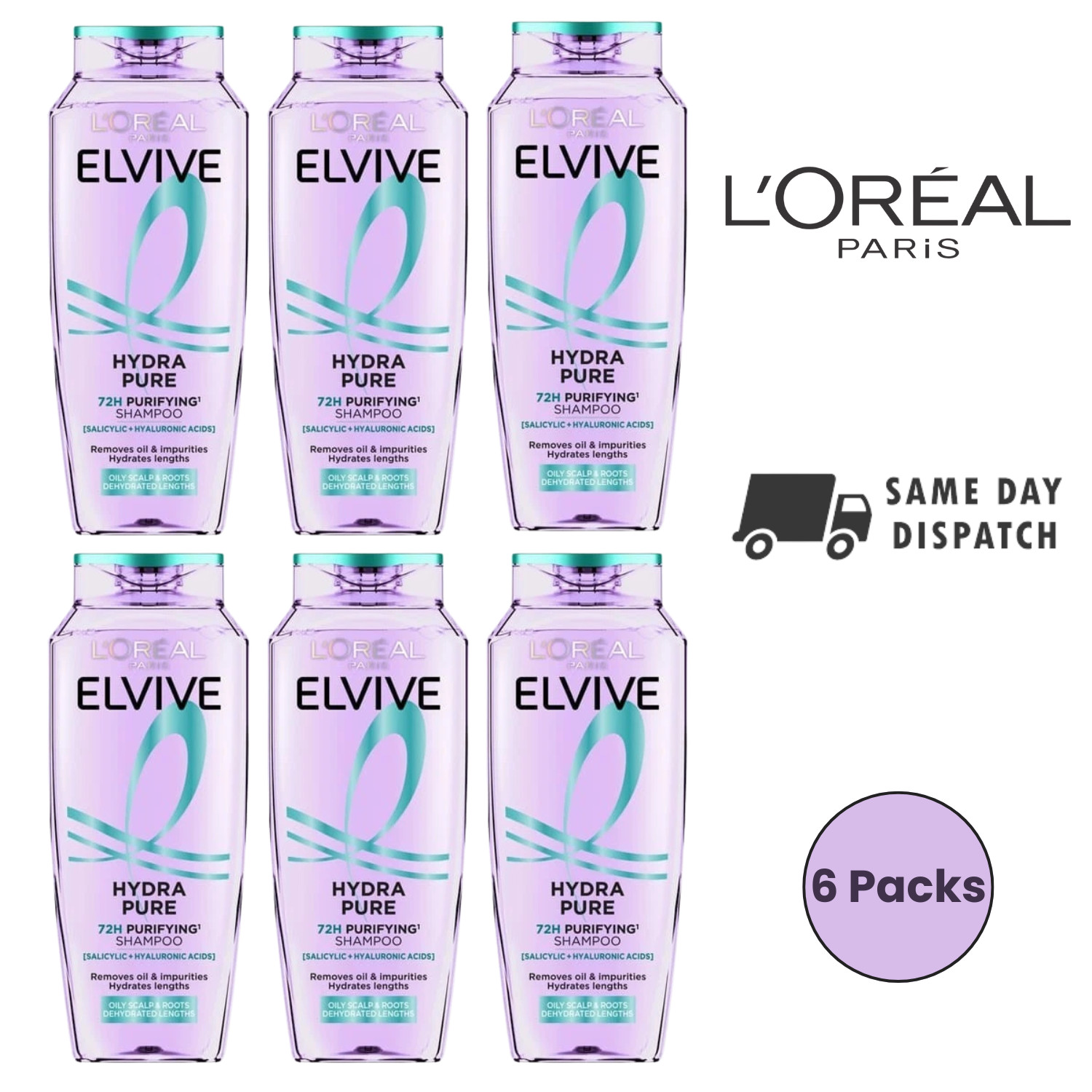 6 x L'Oreal Elvive Hydra Pure 72H Purifying Shampoo 250ml