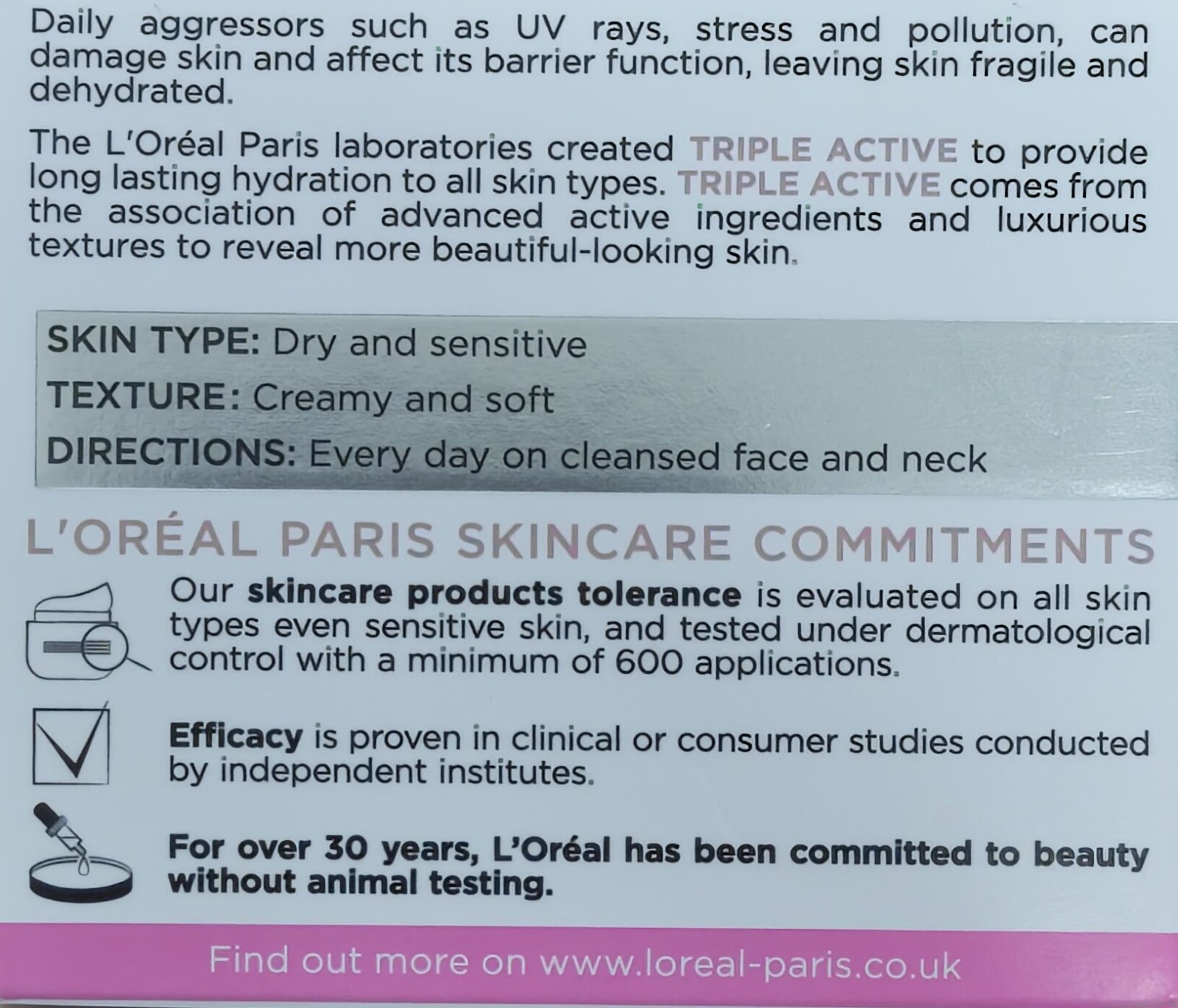 (D) L'Oreal Triple Active Multi Protection Moisturiser Day Cream, 50ml, New