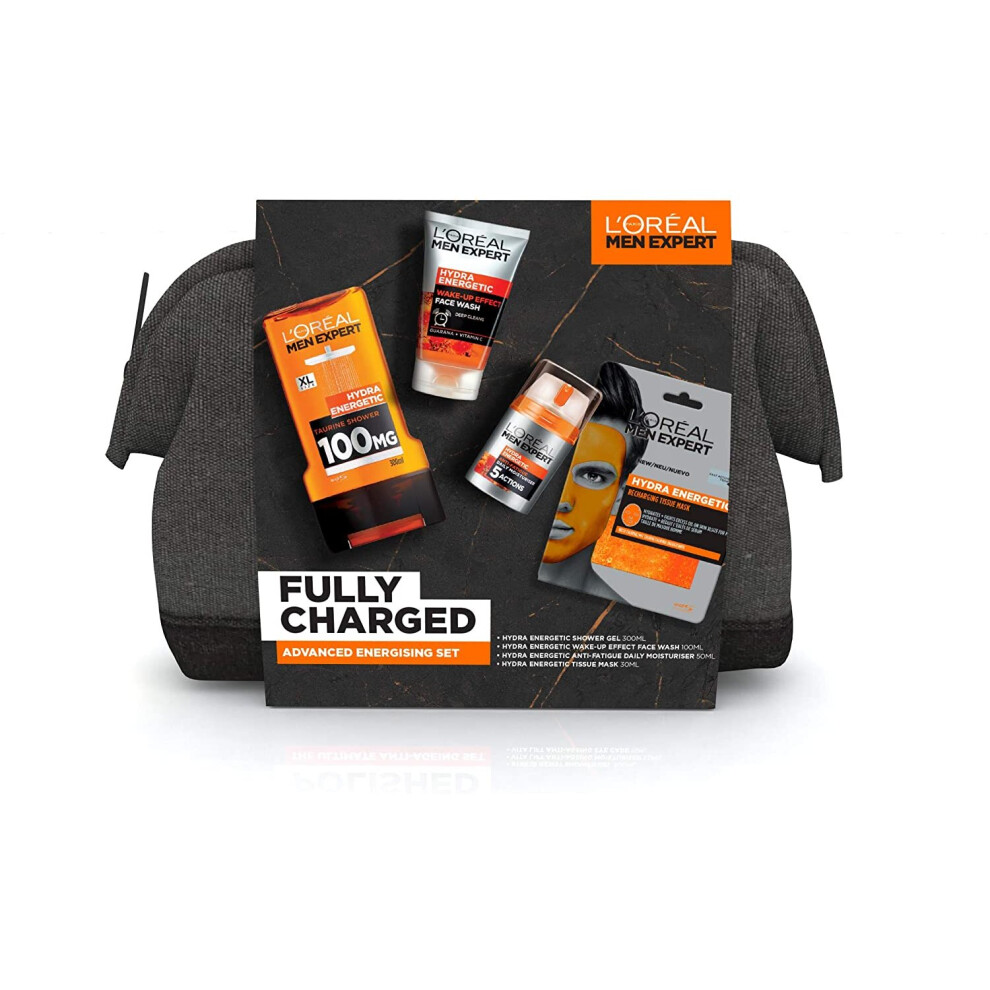 L'Oreal Men Expert Gift Set for Men, Hydra Energetic Fully Charged Washbag: Shower Gel, Moisturiser for Men, Sheet Face Mask and Face Wash