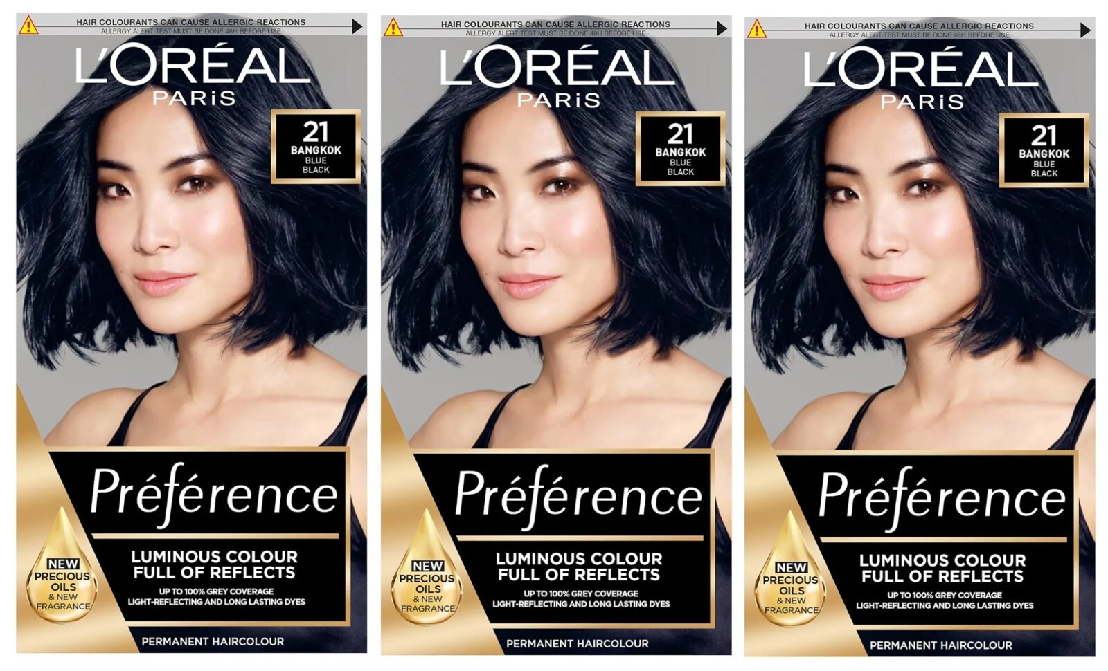 L'Oreal Paris Preference Permanent Hair Dye Colour 21 Bangkok Blue Black, 3 PACK