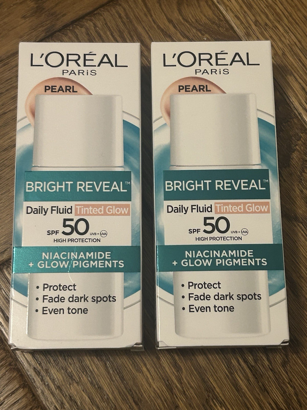 2 X L’Oreal Paris BRIGHT REVEAL Daily Fluid, Tinted Glow, PEARL, SPF50 (BNIB)
