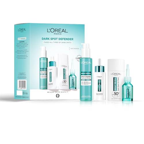 L'Oreal Paris Dark Spot Defender Giftset, 4 Step Routine Powered By Niacinamide; Bright Reveal Spot Fading Serum-in-Cleanser; Niacinamide Dark Spot Serum; SPF 50+ UV Fluid; Exfoliant Peel Treatment