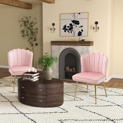 Homgoday Shell Dining Chairs Set of 2, Upholstered Kitchen Chairs with Gold Metal Legs and Backrest, Velvet Fabric Lounge Leisure Chairs for Living Room, Reception Room, Pink ZSSWQ-UKT3398P377926UK
