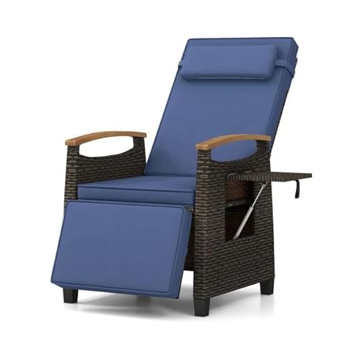 Sedol Patio Rattan Recliner Chair with Adjustable Backrest & Footrest – Relaxing Outdoor Chaise Lounge with Flip Side Table & Cushions – PE Wicker & Steel Frame for Garden, Deck, Poolside (Navy)