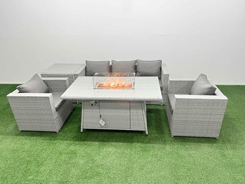 FMSGarden Light Grey Corner Rattan Garden Furniture Set Gas Fire Pit Dining Set Heater Lounge Sofa Side Coffee Table Armchairs