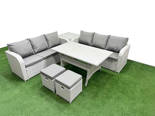 FMSGarden Outdoor Garden Furniture Sets 6 Seater Wicker Rattan Furniture Sofa Sets with Rectangular Dining Table high Back Lounge Sofa 2 Side Table Light Grey