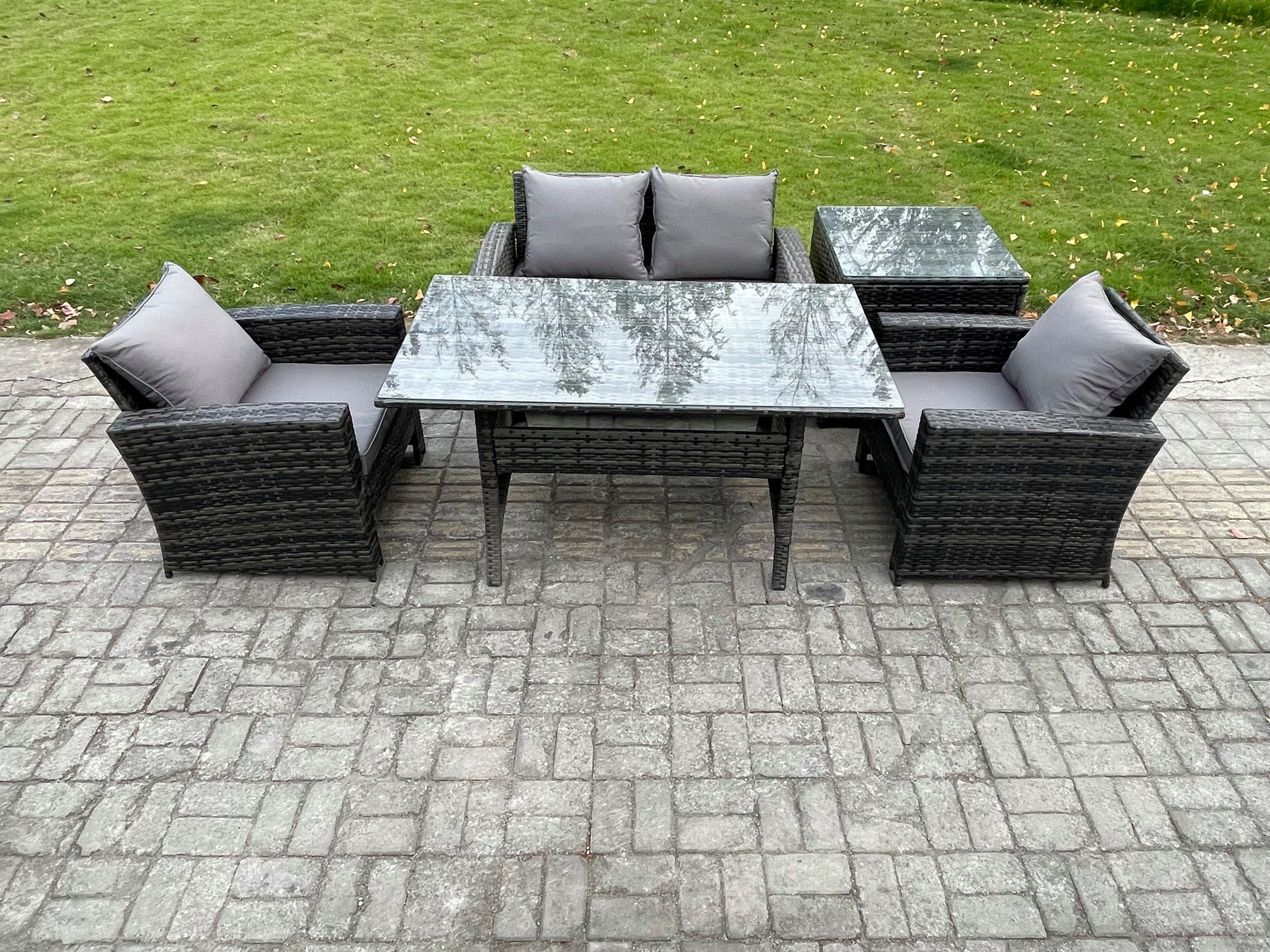 FMSGarden Rattan Garden Funiture Set Height Adjustable Rising Lifting Table Sofa Dining Set Lounge Chair 2 Side Table Footstool