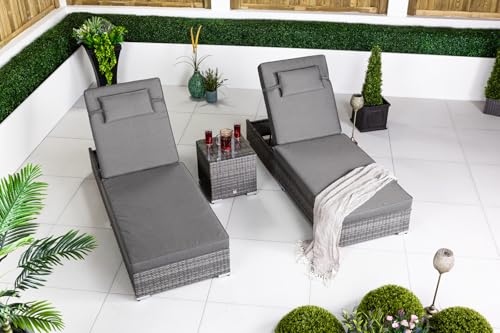 GIARDINO Grey Rattan Sun Loungers Set of 2 with Side Table - 2 x Luxury Rattan Sunbeds Loungers for Garden & Patio Furniture - Aluminum Frame, PE Wicker, 6 Recline Positions, Includes Cover & Cushions