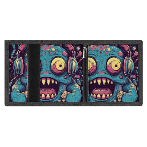 FodPand Minimalist Love Music Monster Trifold Wallet for Men | Slim Front Pocket with Key Hook | Extra Capacity Billfold with 8 Card Slots | 1 Clear Id Window | 1 Zip Coin Pocket | Gift for Him