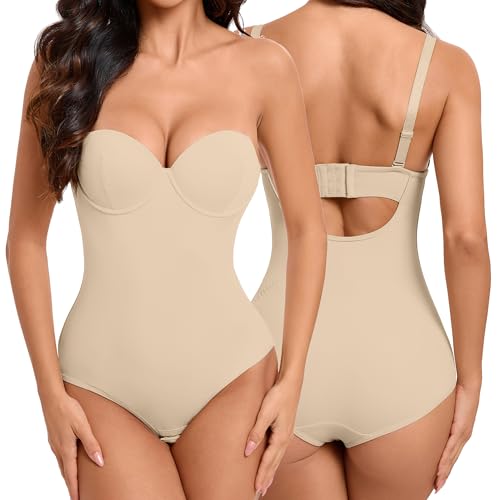 Slimers Backless Shapewear Strapless Bodysuit - Low Back Women Body Shaper : Slimming Built In Bra With Plunge, Beige, Large