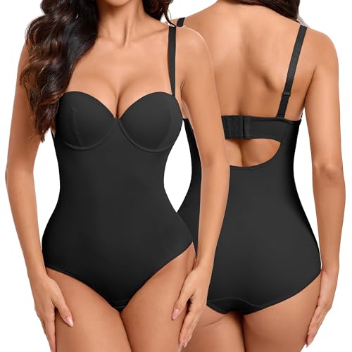 Slimers Backless Shapewear Strapless Bodysuit - Low Back Women Body Shaper : Slimming Built In Bra With Plunge, Black, Medium
