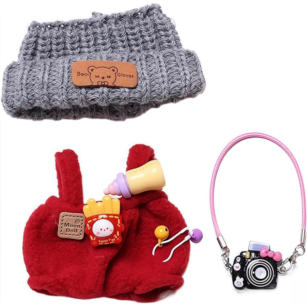 Designer Clothes for 15cm/17cm Lebubu Dolls Premium Lububu Doll Knit Outfit Accessories with Red Sweater Overall Black Camera and Beanie DDK-Red