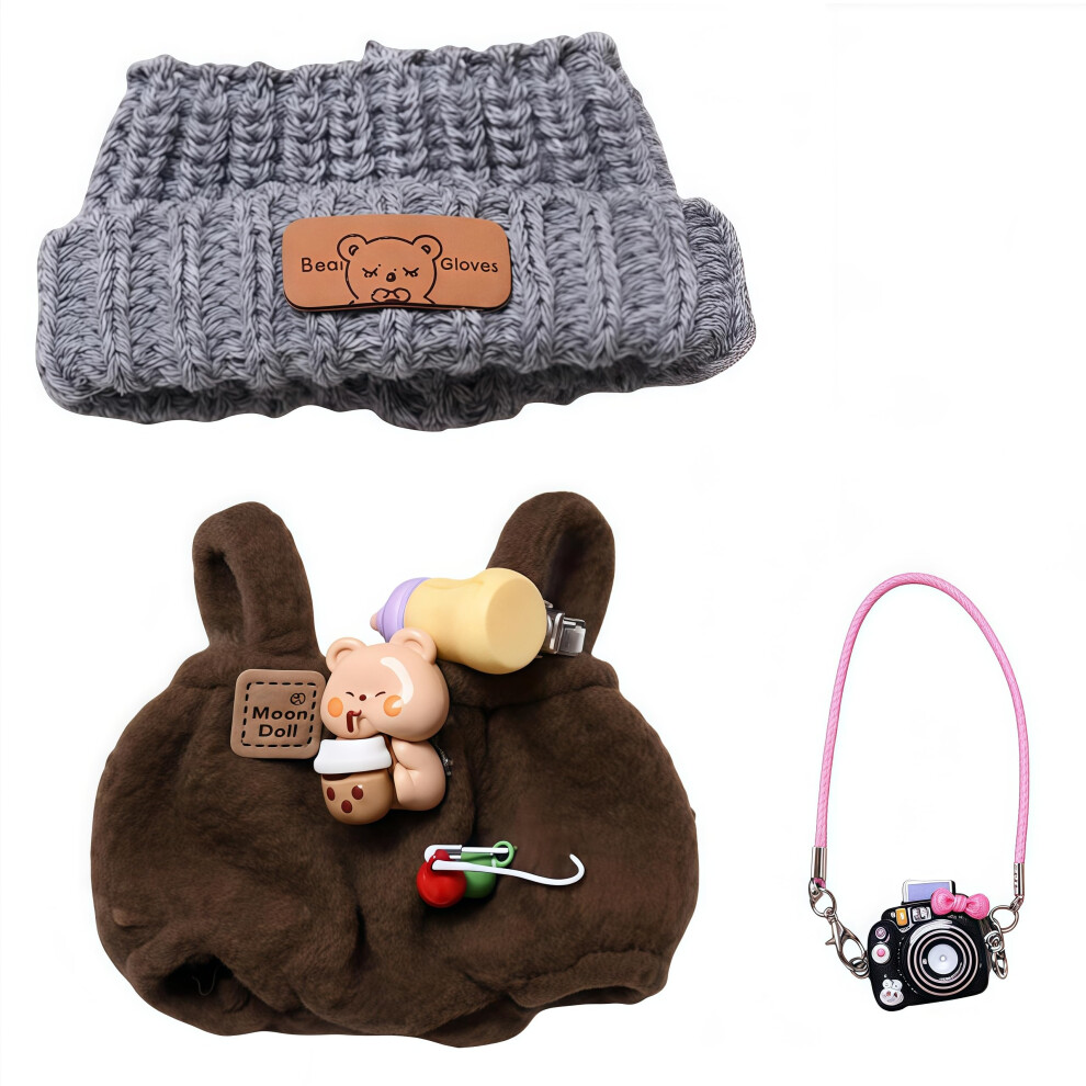 Dolls Designer Clothes for Lububu Doll 17cm Doll Clothes Outfit Accessories with Brown Sweater Overall Black Camera and Beanie DDK-Brown