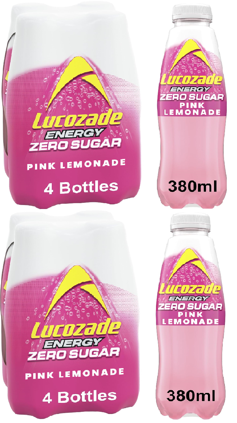 Lucozade Zero Pink Lemonade Fizzy Drink Sugar Free Low Calorie 4x380ml Bottles