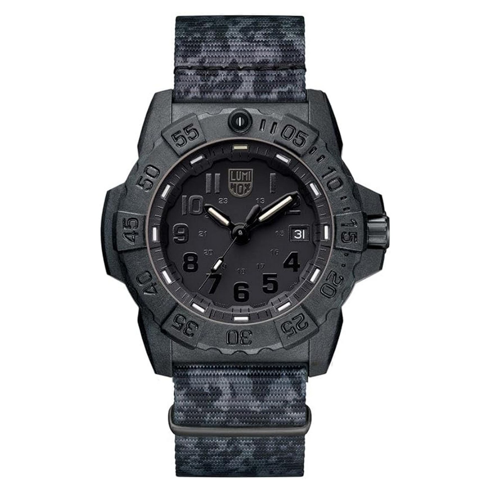 Luminox Navy Seal XS.CE01.BO Watch: Black-Out Dial, Dark Camo Strap, CARBONOX™ 45mm, 200m Water Resistant, Swiss Made, Excellent Visibility, Military Look