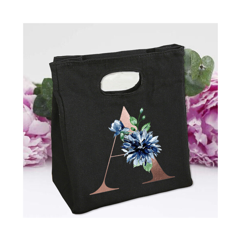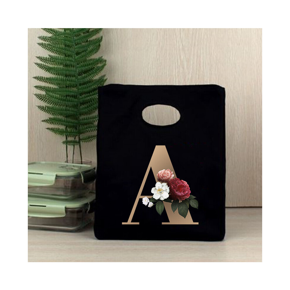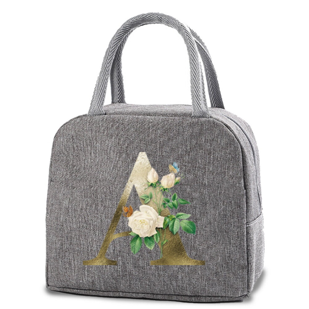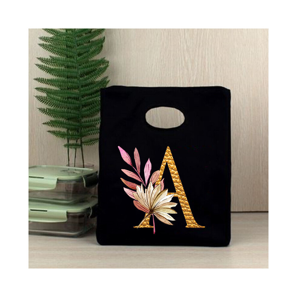 26 Initial Letter Golden Flower Print Cooler Lunch Bag Portable Insulated Bento Tote Thermal Food Travel Picnic Storage Pouch