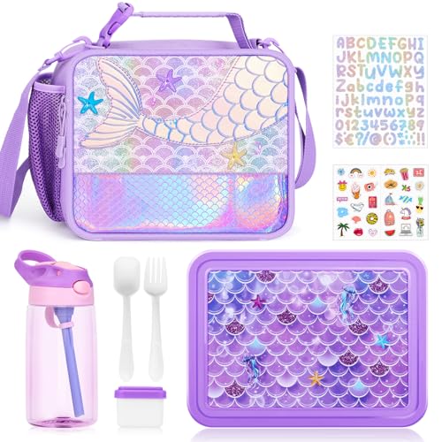3PCS Kids Lunch Bag and Bento Box Set,Insulated Lunch Bag,Multicompartment Bento Lunch Box&Water Bottle for Kids, Leakproof Lunch Containers for Girls/Toddlers Pre-School,Kindergarten (Purple mermaid)