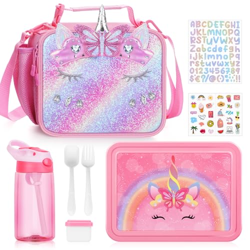 3PCS Kids Lunch Bag and Bento Box Set,Insulated Lunch Bag,Multicompartment Bento Lunch Box&Water Bottle for Kids, Leakproof Lunch Containers for Girls/Toddlers Pre-School,Kindergarten (Pink Unicorn)