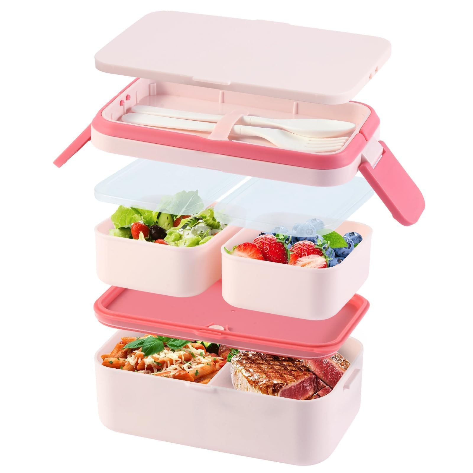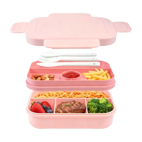 Cylogia 1250ML Bento Lunch Box for Kids & Adults Leak-Proof Packed Lunch Box with 3 Compartments Stackable Lunchbox with Sauce Pot Cutlery Set Microwave Dishwasher Available