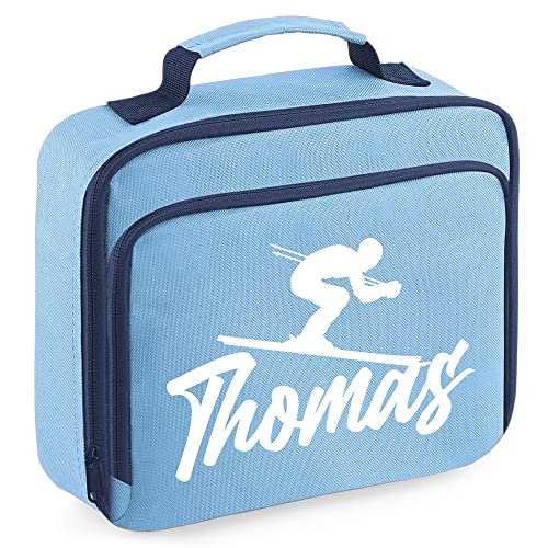 Personalised Boys Skiing Lunch Cooler Bag, Custom Skiing Gifts Boys Lunch Box, Back to School Gifts for Son who Loves Skiing, 24cm x 20cm x 8cm, Sky Blue