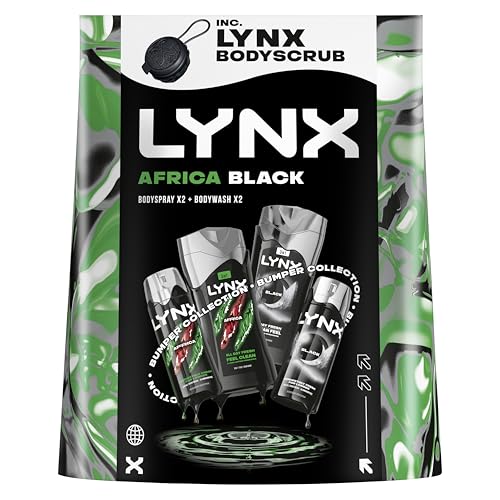 Lynx Africa & Black Bumper Gift Set with two body wash and body spray duos & a Body Scrub Tool perfect gifts for him 4 piece