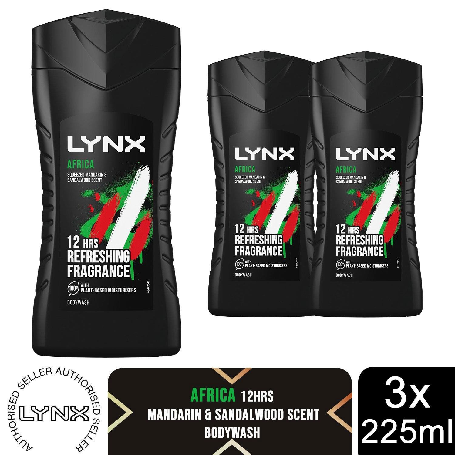 Lynx Men Africa 3-in-1 Hair, Face and Body Wash Shower Gel with mandarin & sandalwood for an all day fresh & clean feel 225 ml, Pack of 3