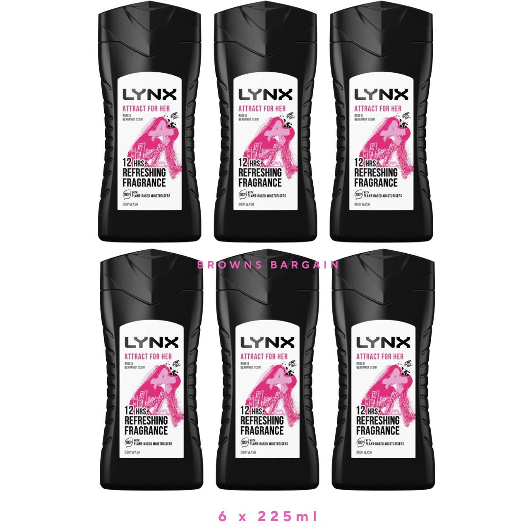 6 x Lynx Attract for Her ROSE & BERGAMOT Fragrance Bodywash Shower gel 225ml