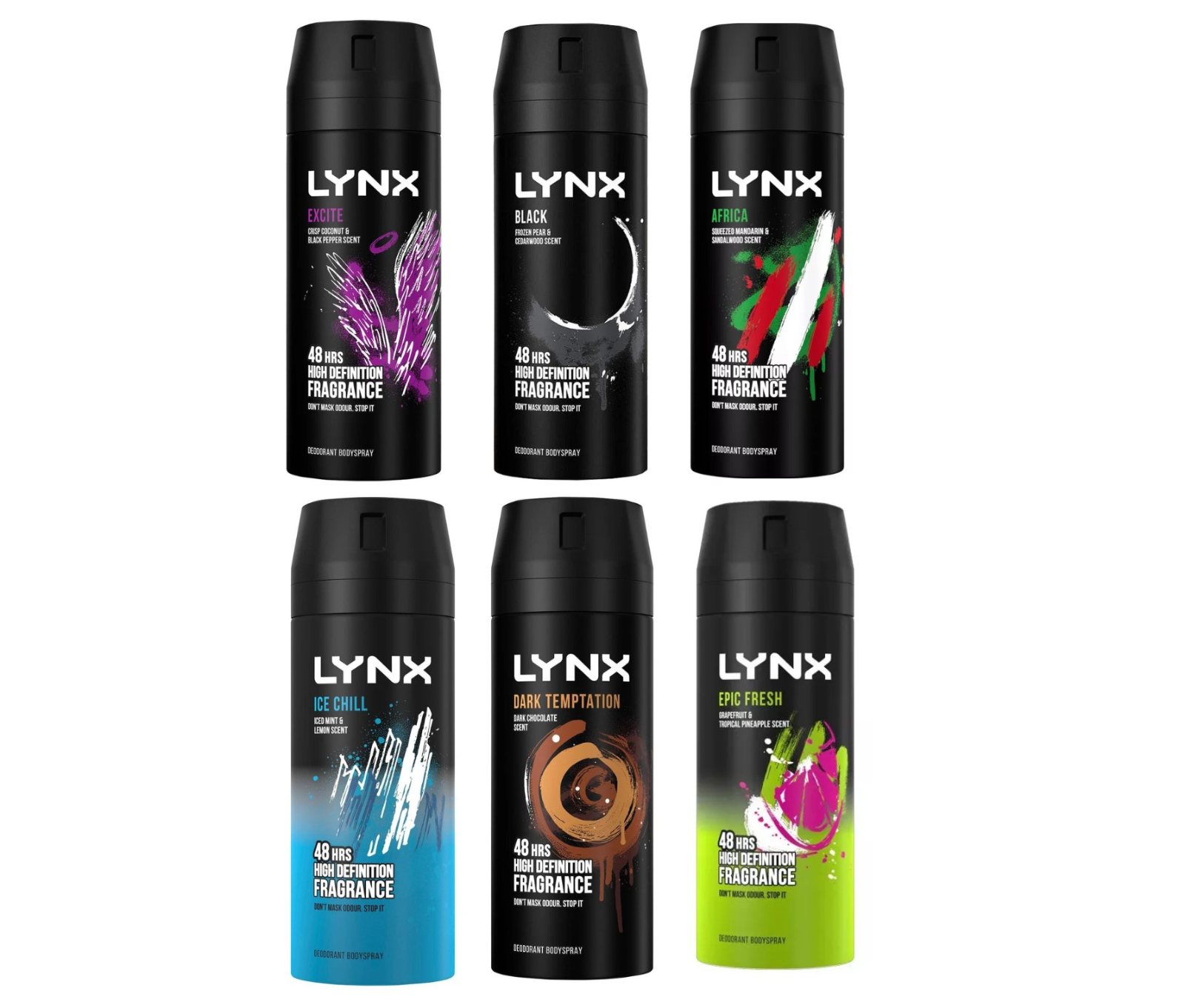 6 x 150ml Lynx MIX Deodorant Body Spray Africa, Dark Temptation Ice Chill Excite