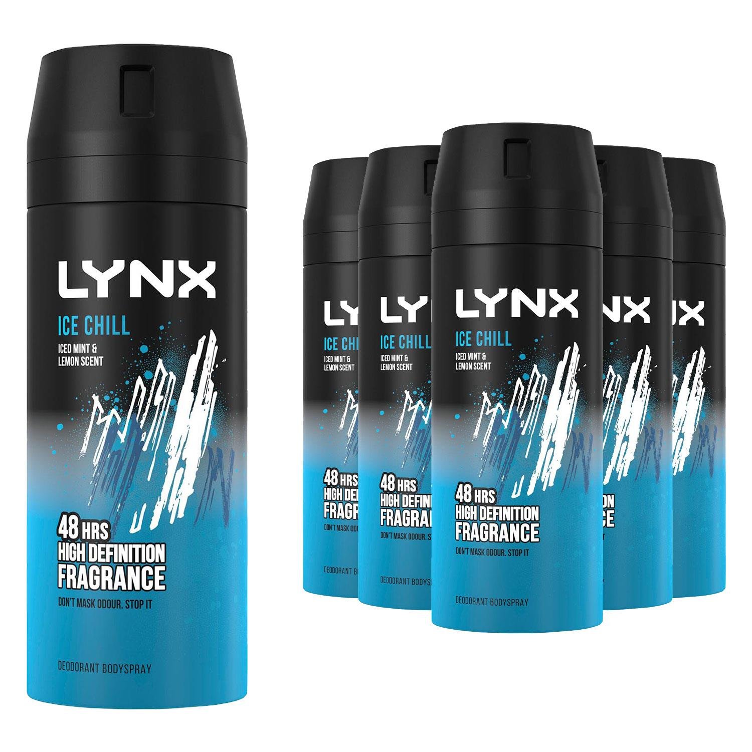 Lynx Men Ice Chill Deodorant Body Spray for 48 hours of odour-busting, high definition fragrance, with an iced mint & lemon scent 150 ml, Pack of 6
