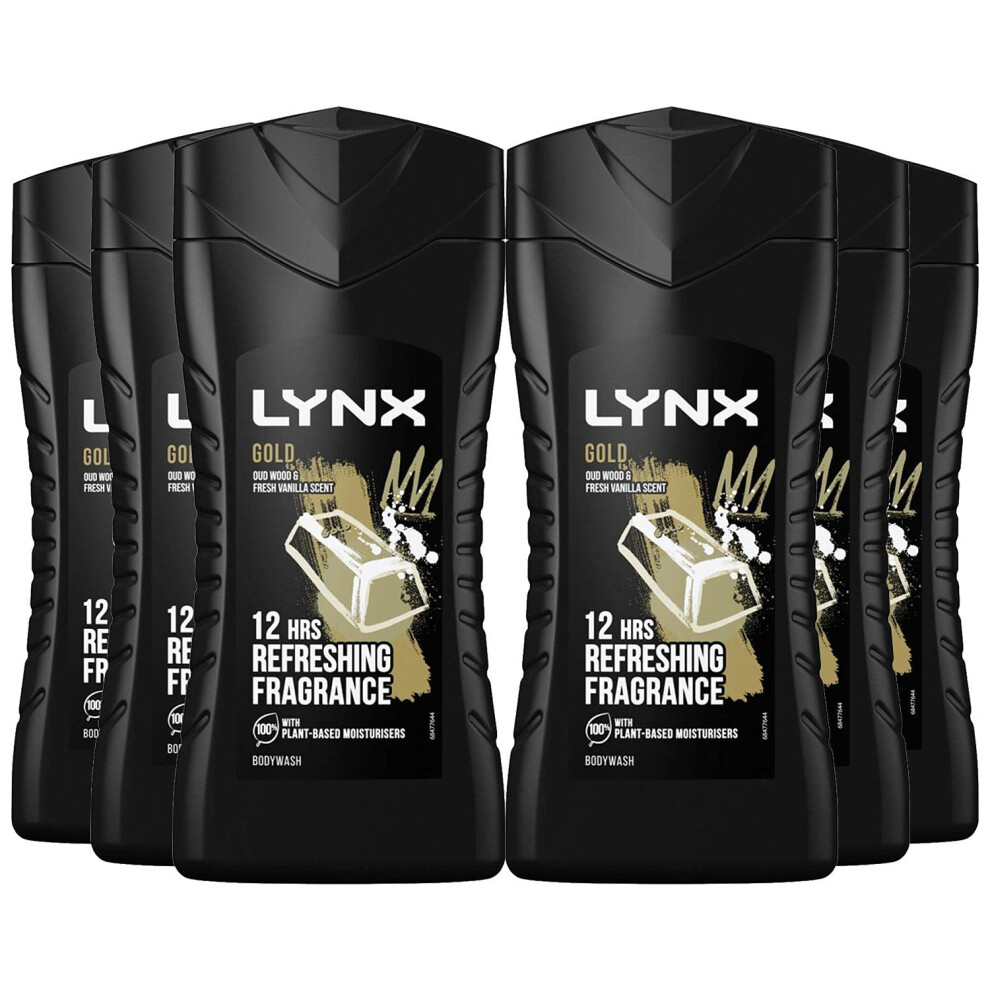 6 Pack of Lynx 12 Hour Refreshing Fragrance Gold Oud Wood and Vanilla Body wash with Plant-based Moisturisers & Dual Action Power, Keep Smelling