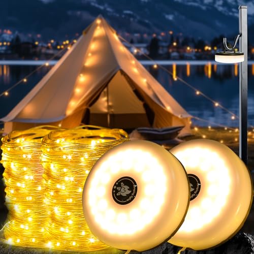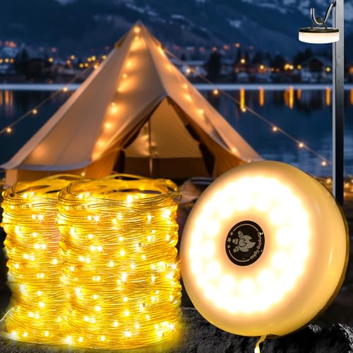 2Pcs Camping String Lights 10M, 2000mAh Waterproof Portable Outdoor String Lights with 8 Lighting Modes, Rechargeable Retractable Camping Fairy Lights with 30S Quick Storage for Yard RV Camping Tent