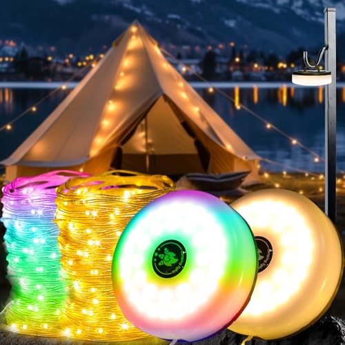 Camping String Lights 10M,2 in 1 RGB & Warm USB Fairy Lights 8 Lighting Modes,Rechargeable tent lights 30s Roll up Portable Stowable String Light for Garden,Gazebo,Camping,Party,Christmas