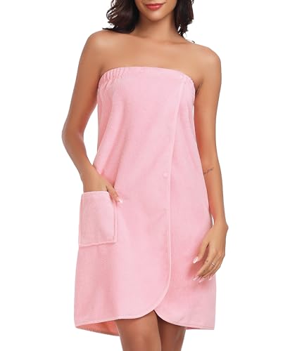 Lovasy Women's Wrap Towel Robe Wrap Spa Bathrobe Terry Towelling Bath Robes for Women Adjustable Buttons Closure Shower Towel,Pink,S-M